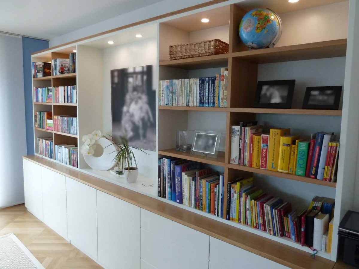 Wandschrank MDF weiss lackiert Mit Eiche Massivholz Elementen kombiniert Skip back to main navigation